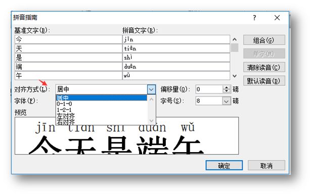 Nell'assistente di Pinyin, possiamo cambiare "Allineamento" e selezionare "Centro".
