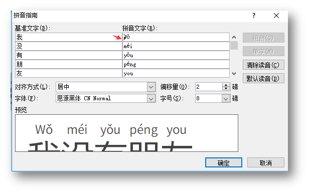 4. Continua a regolare e a posizionare il Pinyin sul lato destro della parola, sul lato destro della frase o sotto la frase.